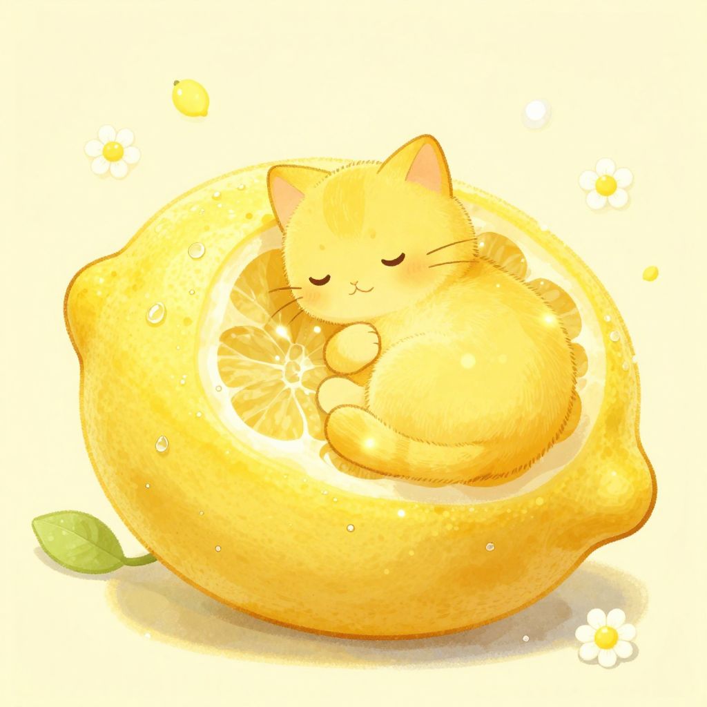 Digital illustration of a cute, chubby, orange cat with closed eyes and a small smile, nestled comfortably inside a bright yellow, round, citrus-like fruit with a shiny texture. The cat's paws are folded in front of its chest. The fruit has a small green leaf on the left and a white flower with a yellow center at the bottom right. The background is white with subtle yellow sparkles, enhancing the whimsical and cheerful feel of the image. The style is reminiscent of Japanese kawaii (cute) art.