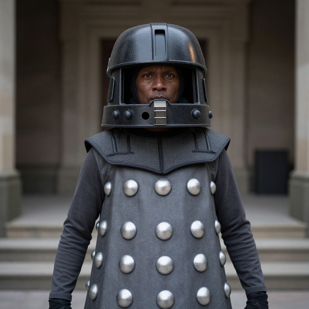 "Who Dalek Costume, image of a man dressed in a costume and helmet"