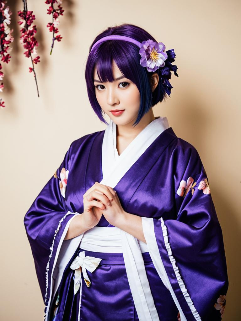 Photo-realistic cosplay photo of person standing in haruka (new year) (blue archive) costume. 1girl, purple eyes, hair between eyes, purple hair, medium hair, short hair, purple hairband, sidelocks, hair flower, purple kimono, frilled kimono, purple kimono, frilled kimono, print kimono, halo, wide sleeves, long sleeves, obifull body shot. lifestyle stock photo, shallow depth of field, lifestyle stock photography, shallow depth of field, natural lighting, warm tones, soft background blur, vibrant colors, realistic textures