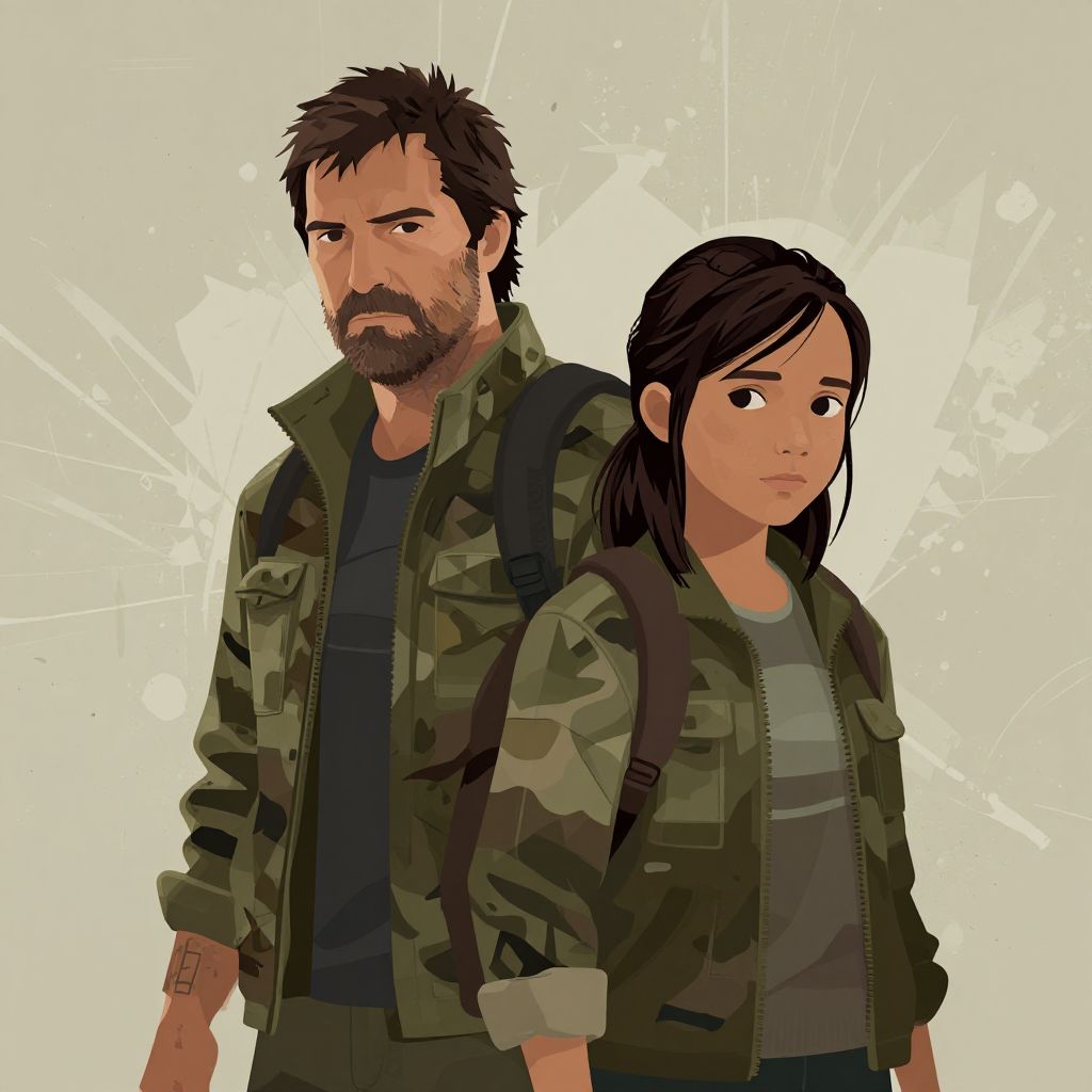 The image is a vector graphic featuring two characters from the game \"The Last of Us.\" The character on the left is a man with a beard, wearing a camouflage jacket, and has a serious expression. The character on the right is a young girl with long hair, also wearing a camouflage jacket, and looking off to the side. Both characters are depicted in a stylized, artistic manner with a limited color palette dominated by earthy tones. The background is a textured, grunge-style design with splatters and streaks, adding to the gritty, post-apocalyptic atmosphere of the scene. The overall composition is balanced, with the characters positioned centrally and slightly overlapping, creating a sense of depth and interaction.