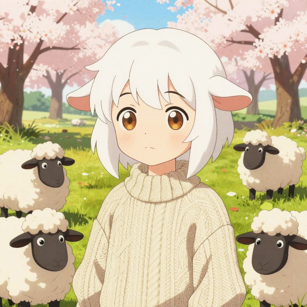 Anime sheep girl wearing a cozy wool sweater, surrounded by cute sheep, gentle expression, cherry blossom trees in the background, vibrant colors, intricate line art