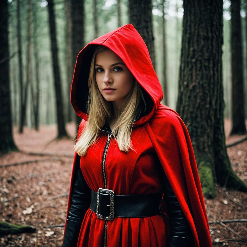 Jedi knight costume ,solo, 1girl, hood, outdoors, blonde hair, looking at viewer, realistic, cloak, scar, belt, tree, cape, standing, closed mouth, blurry background