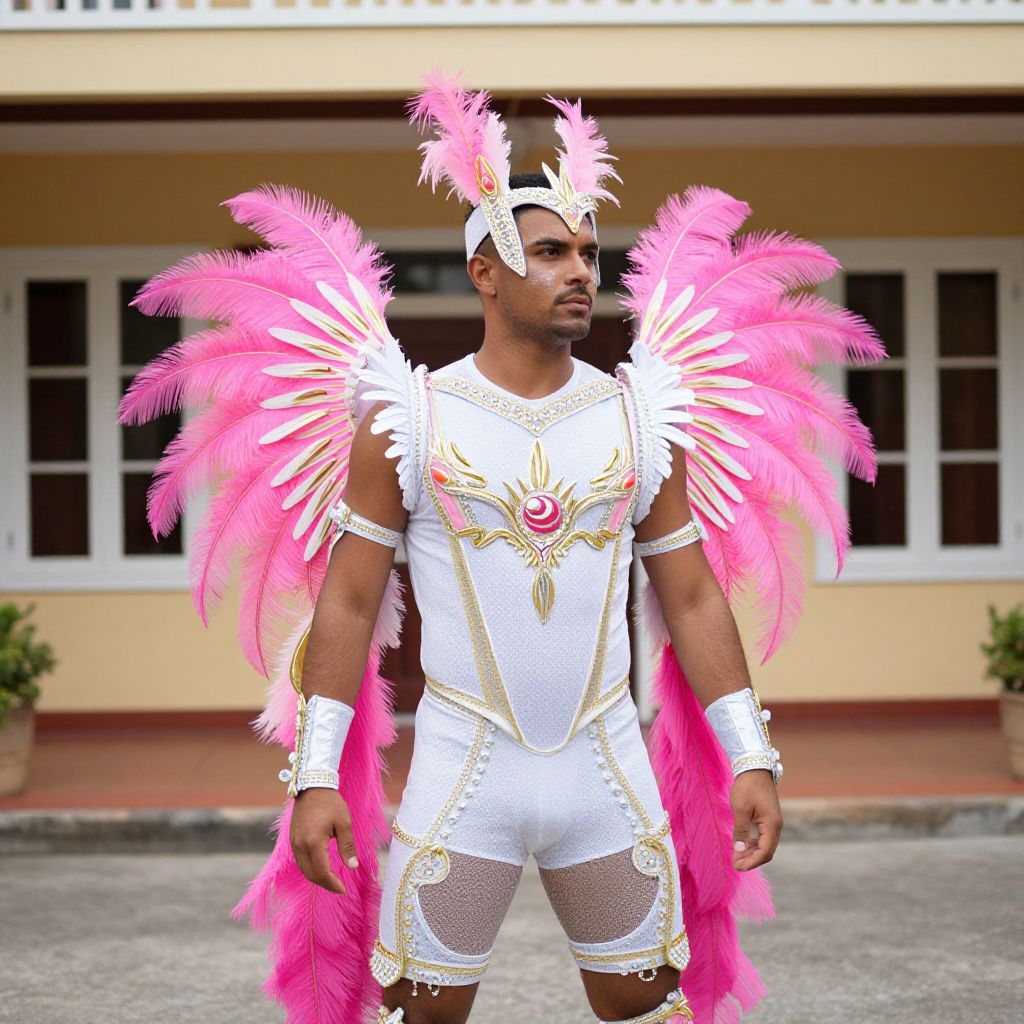 Photograph of a muscular, dark-skinned man with short hair, standing outdoors in front of a beige building with white-framed windows. He wears a white, tight-fitting bodysuit with gold and pink embroidery, accented by pink feathered wings on his shoulders, and a matching feathered headdress. His outfit is complemented by white wristbands with gold detailing. The background includes a gray pavement and potted plants. The vibrant pink feathers contrast sharply with the white and gold of his attire, creating a striking visual effect. The man has a confident, poised expression.