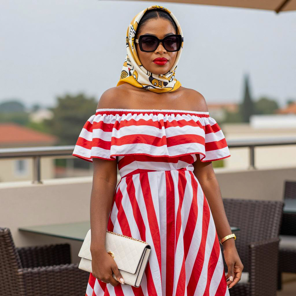 Portrait of a fashionable dark-skinned woman wearing an off-shoulder red and white striped dress, a gold-patterned headscarf, large black sunglasses, and red lipstick. She holds a white quilted clutch with a gold chain, standing outdoors on a balcony or terrace with wicker chairs and a railing in the background in bright daylight.