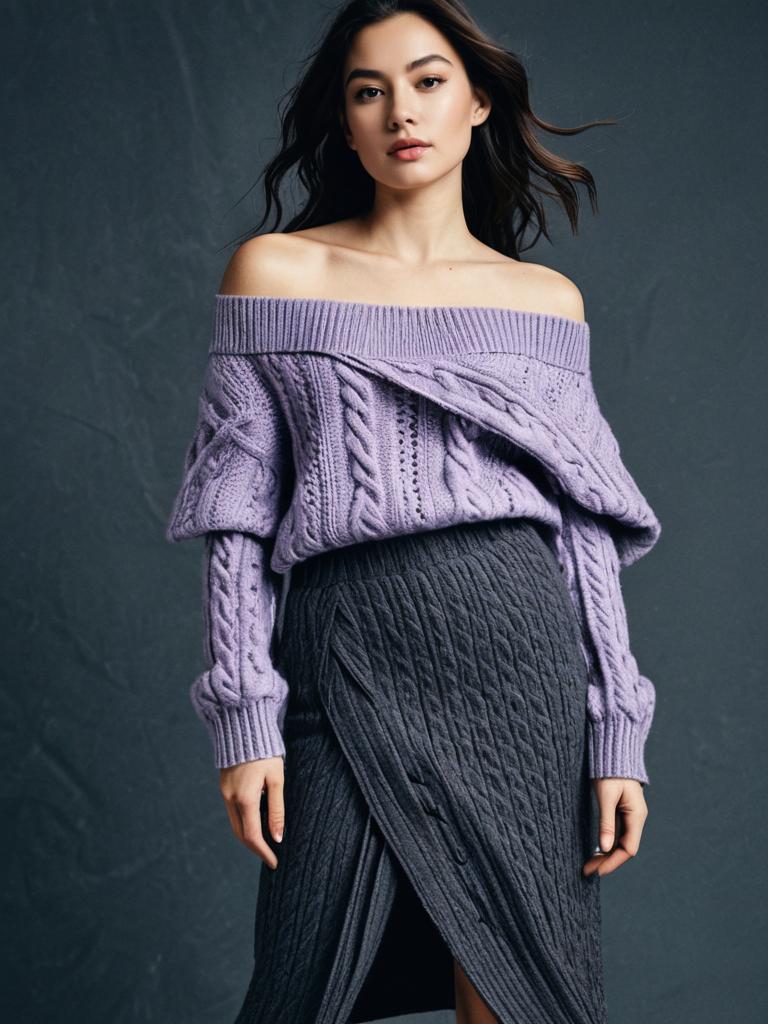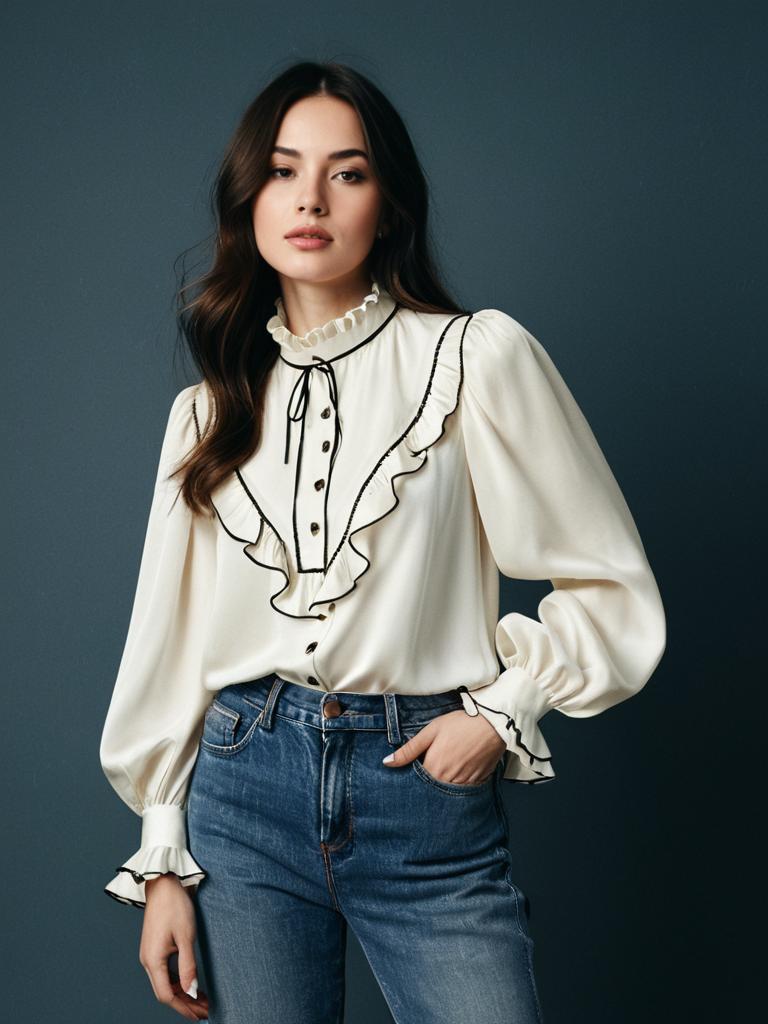 Woman, contemporary chic, blue silk blouse with flared bell sleeves and boat neckline, black pencil skirt, high waist, studio background