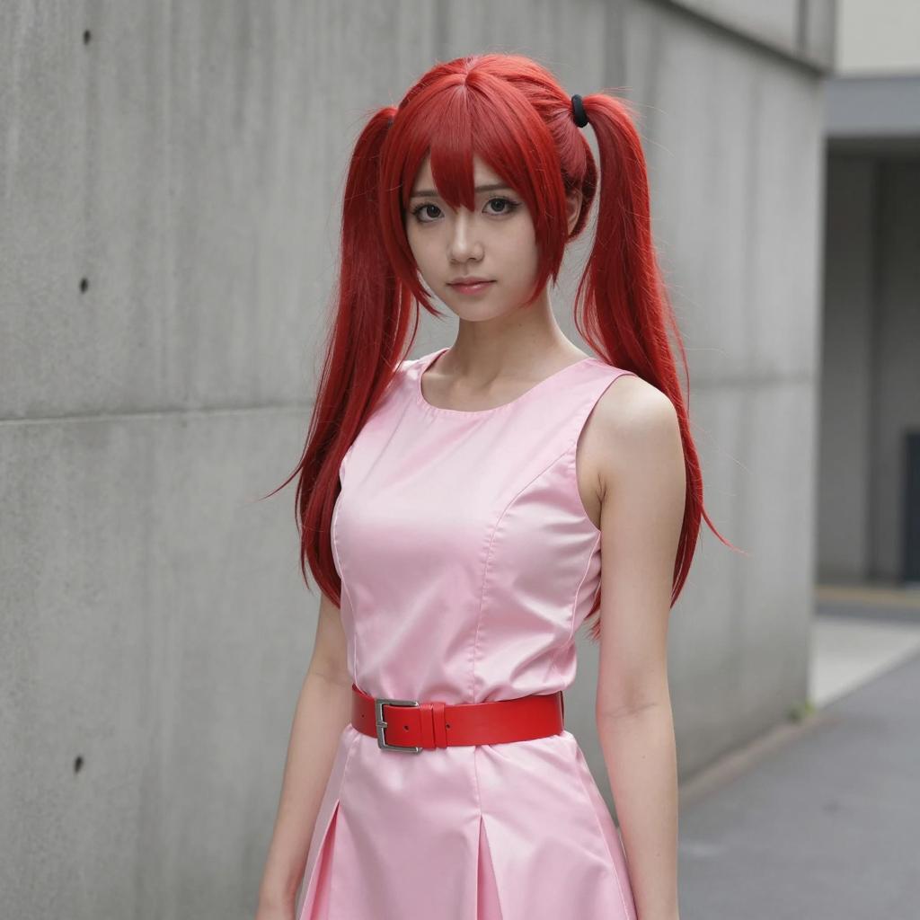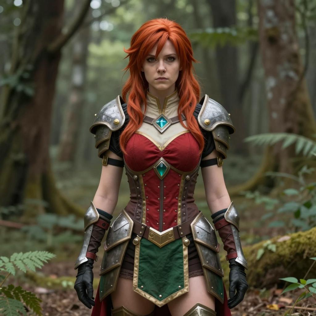 Holly wood cosplay, photorealistic, portrait of a young woman with orange hair in pigtails, wearing a superhero costume, red and silver with black accents, yellow cape, serious expression, standing in a forest, blurred green background, soft lighting, natural setting, digital artwork, high detail, realistic ures, green eyes, medium build, focused gaze, cosplay style, medium shot, slightly frontal, soft shadows, detailed hair strands