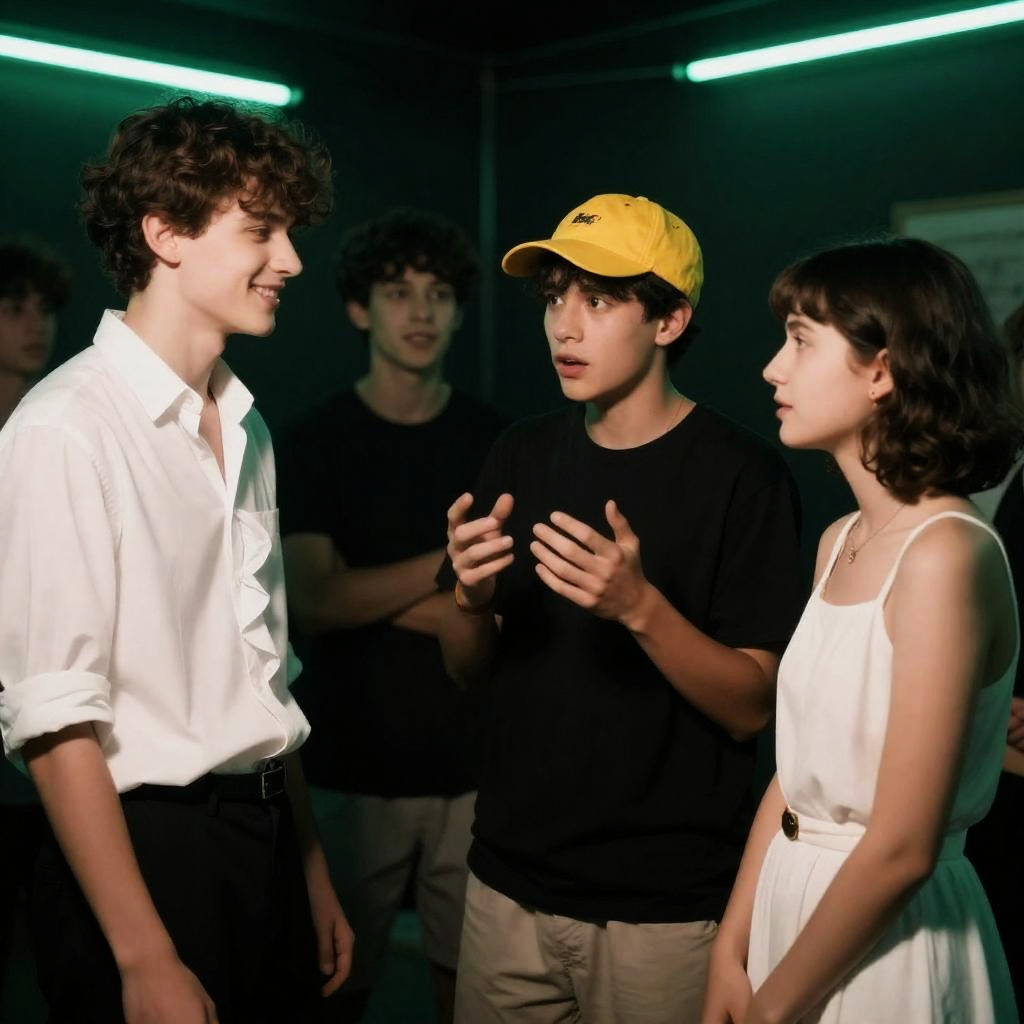 Photograph of four young people in a dimly lit room with green neon lights. Three males in dark clothing, one with a yellow cap. One female with short brown hair, white dress. Male on left with ruffled white shirt, smiling. Male in center, gesturing with hands, slightly open-mouthed. Female on right, looking at males. Background shows other partially visible people.