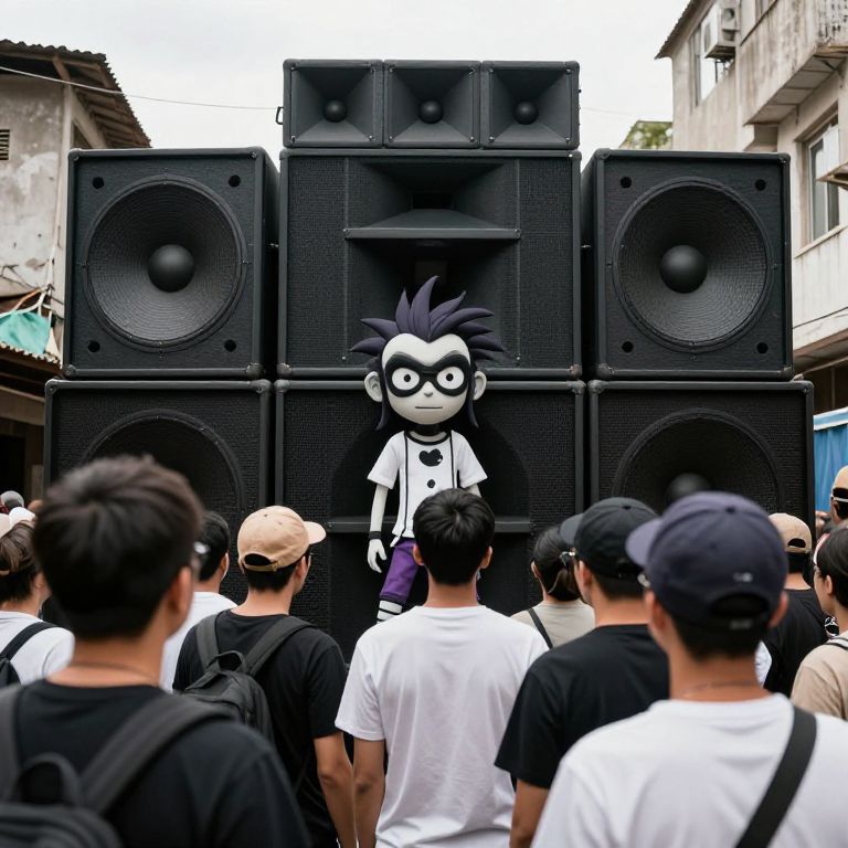 A crowd of people gathers around a giant speaker wall in a run-down block, with a Gorillaz-style character emerging from the speaker.