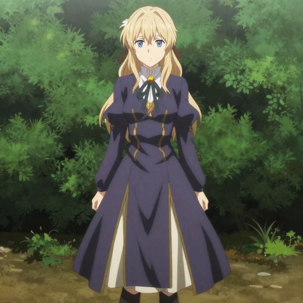 Violet Evergarden Movie Dress Costume, woman in a purple dress standing in front of a bush