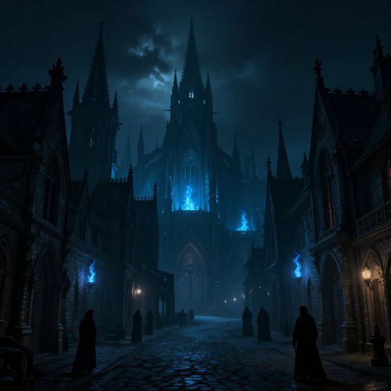 Medieval dark fantasy art showing a gothic fantasy city at night, illuminated by eerie blue flames, with towering spires, cobblestone streets, and mysterious cloaked figures lurking in the shadows, moody atmosphere with rich textures