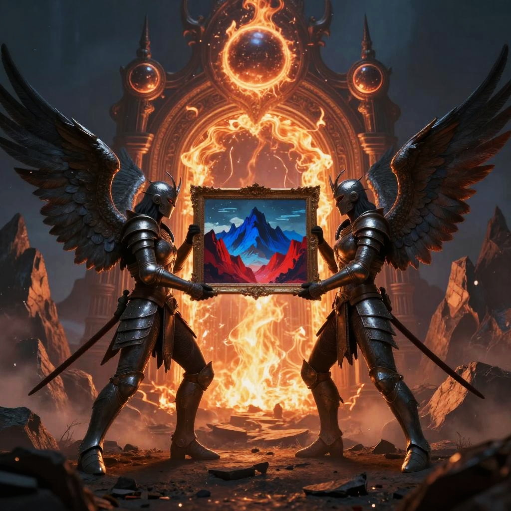A surreal digital artwork featuring two armored, winged figures facing each other, holding a frame with a vivid landscape of blue and red mountains. They stand in front of an ornate, fiery portal with swirling flames and two celestial orbs above. The background has dark, jagged mountains, and the ground is rocky and uneven. The scene is dramatic and otherworldly.