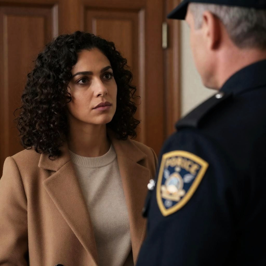 Woman with curly brown hair stands in doorway holding a black object, wearing gray blazer, black skirt, and heels. Floral-patterned walls, brown door, beige carpet. Black bag on floor. Intense expression. Mid-action pose. Indoor setting.