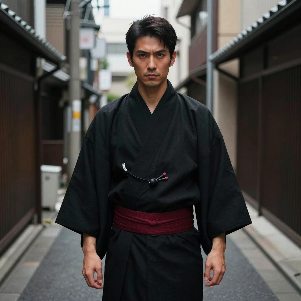 A man stands confidently in a narrow, urban alleyway wearing a modern black kimono with a deep red obi belt. The moody lighting and sharp focus on his intense expression evoke a cinematic, dramatic atmosphere with a contemporary take on traditional Japanese attire.