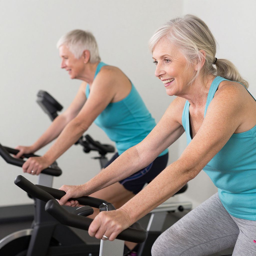 Photograph of an elderly white couple exercising on stationary bikes in a bright gym, wearing orange and blue shirts, smiling.