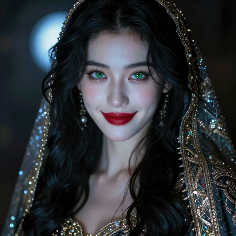 This digital portrait features a striking young woman with pale skin, vivid green eyes, and red lipstick, wearing a detailed, ornate veil adorned with gold and silver patterns. Her long, wavy black hair cascades beneath the veil. The background is dark, with a subtle, out-of-focus blue light on the left, adding a mystical ambiance. Her expression is gentle and slightly enigmatic, with a soft smile. The image has a realistic yet slightly ethereal quality, emphasizing her glowing skin and intense eye color. The overall style is hyper-realistic digital art.