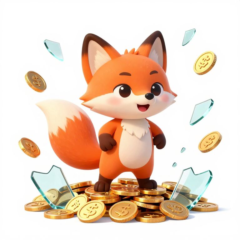 A vibrant, cartoon-style fox stands triumphantly on a pile of coins, surrounded by shattered glass and coins in the air, against a white background.