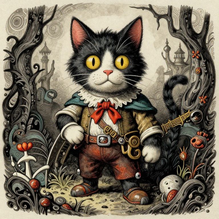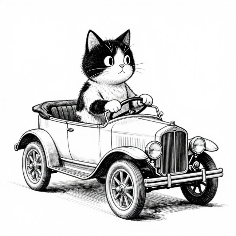 A black and white sketch of a cat driving an old-fashioned car, detailed linework, vintage theme, classic art style, minimal background, focus on character expression