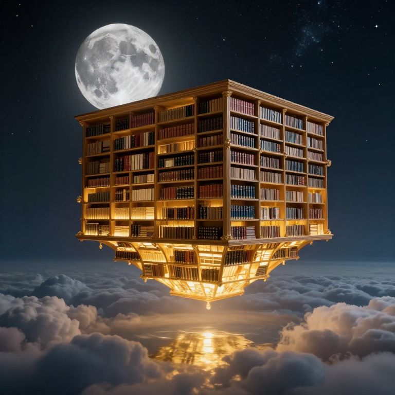 A majestic, infinite library suspended in the cosmos, its golden glow reflected upon a tranquil sea of clouds beneath, while a massive moon looms in the starlit sky above.