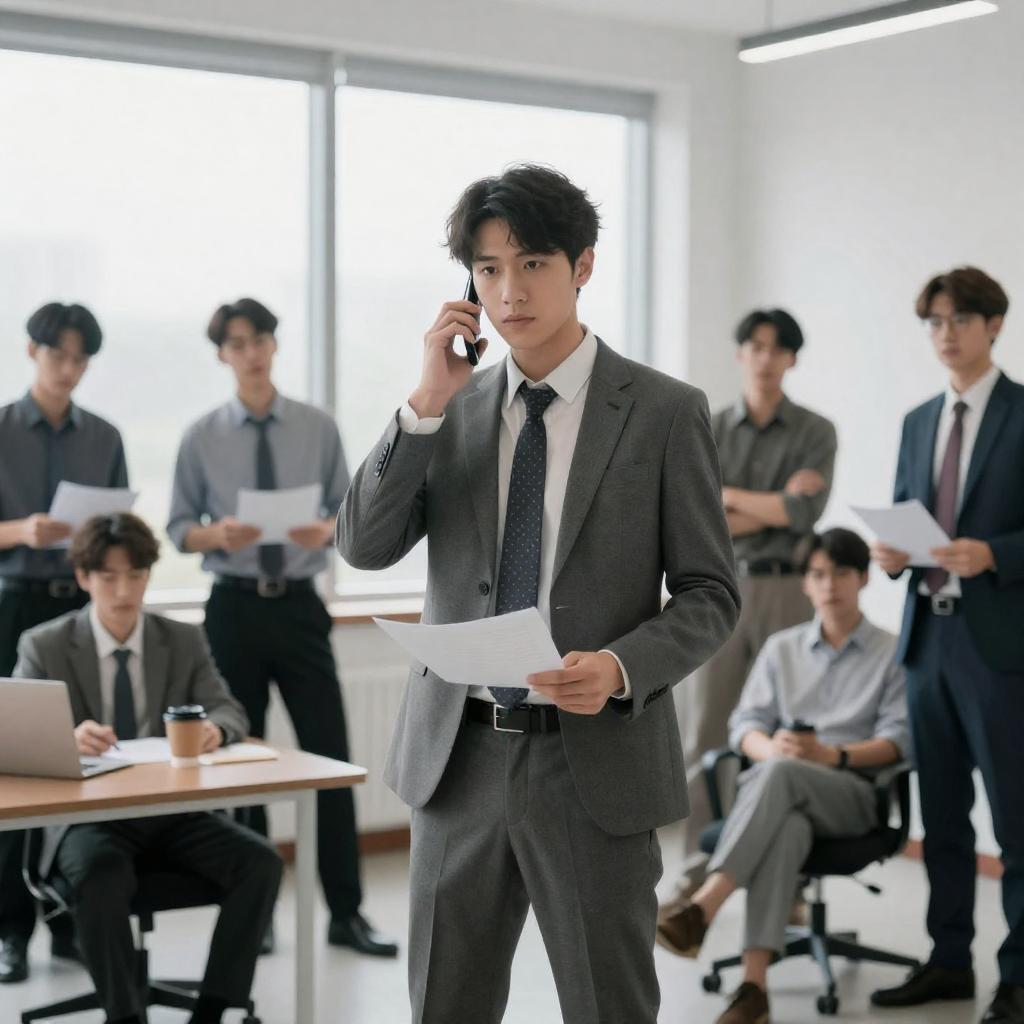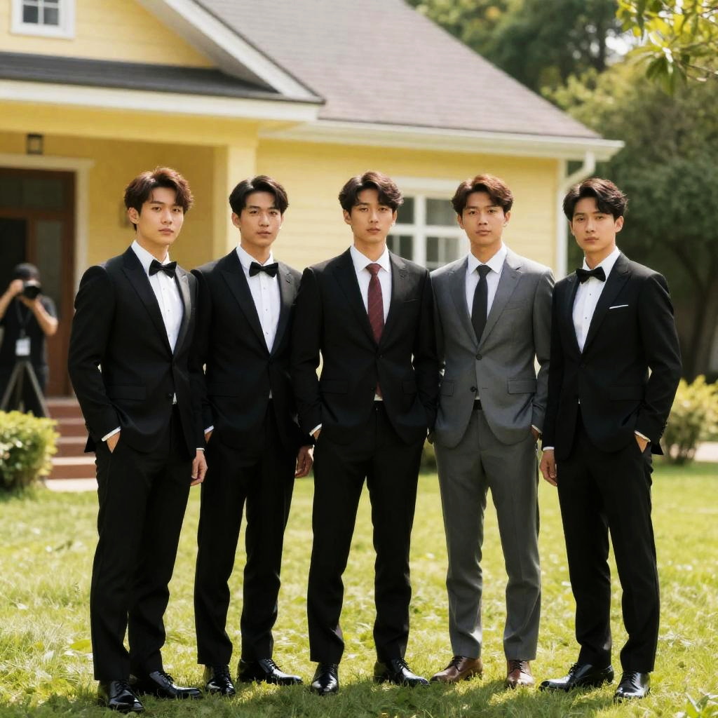 Photograph of four men in black suits seated at a formal dining table. Center and left men have intense expressions. Right man with glasses looks forward. Background: waiter in white uniform, large floral arrangement, ornate mirror, fruit bowl. Table: glassware, flower arrangement, plates.