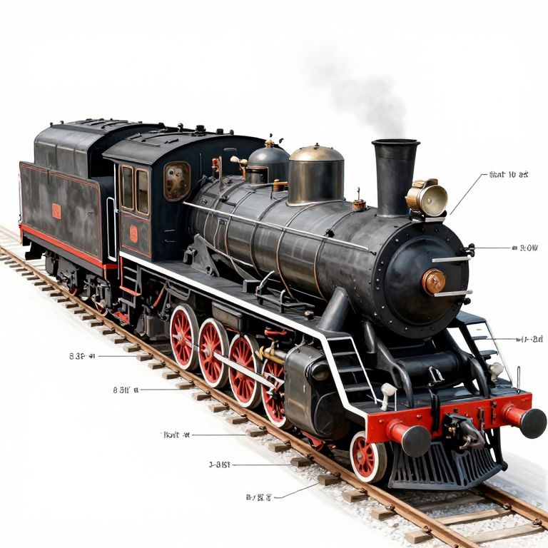 How to draw a train realistic, artistic tutorial style image showing the anatomy of a steam locomotive, exploded view with labeled parts, realistic textures and shading on each component, instructional and visually engaging digital artwork