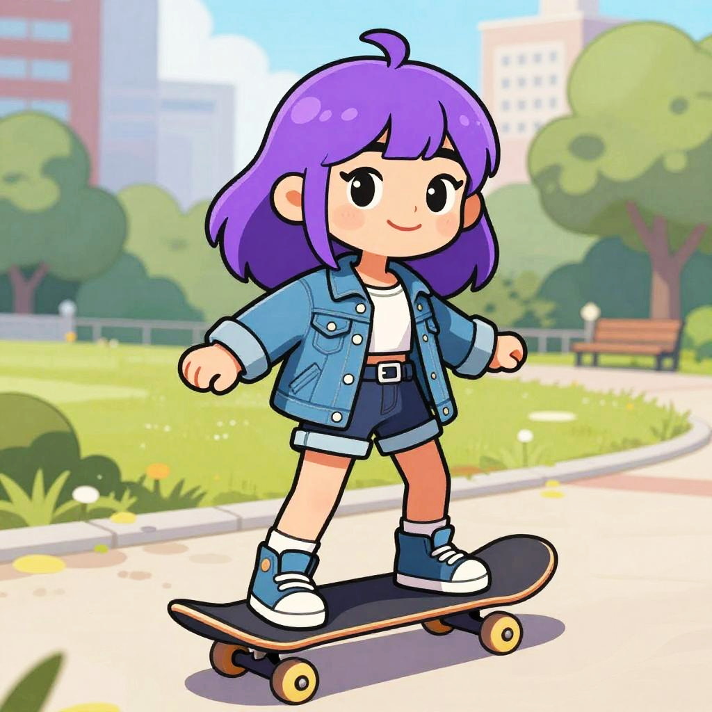 Purple hair cartoon girl with a playful smile, wearing a casual outfit with a denim jacket and sneakers, skateboarding in a sunny urban park, bright and energetic colors, smooth line work with a comic book feel.