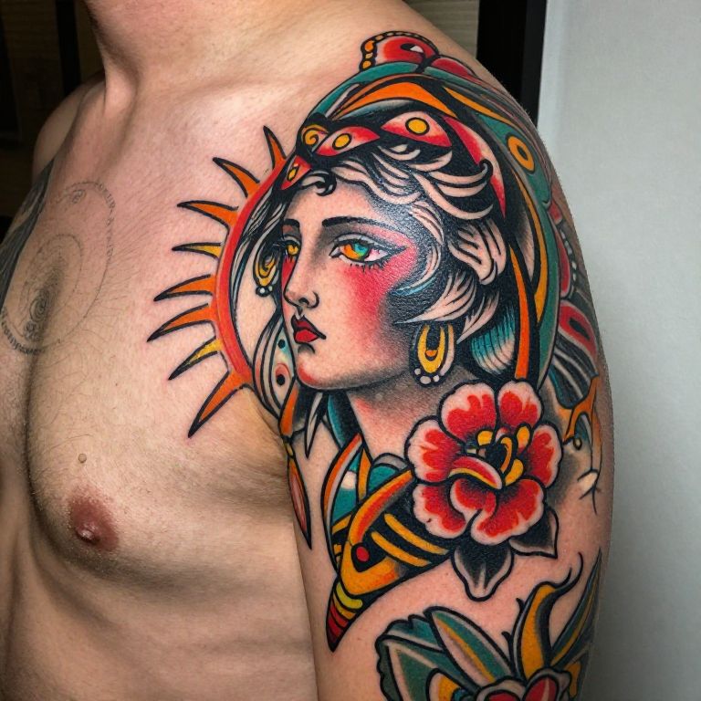 Tattooed man's bare shoulder featuring vibrant, traditional-style sun goddess with orange sun, red flower, and detailed green, red, and yellow