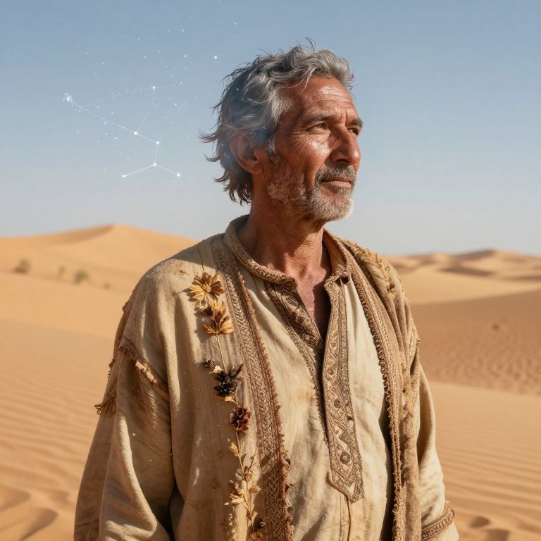 Photograph of an older Middle Eastern man with gray, wavy hair and a beard, standing in a desert with golden sand dunes under a clear blue sky. He wears a beige, embroidered traditional robe with intricate floral patterns. His expression is thoughtful, and his gaze is directed upward. A faint constellation is digitally superimposed behind his head. The sunlight casts soft shadows on his face and robe, highlighting the textures of the fabric and the desert's rippled sand. The overall composition evokes a sense of ancient wisdom and connection to the desert environment.