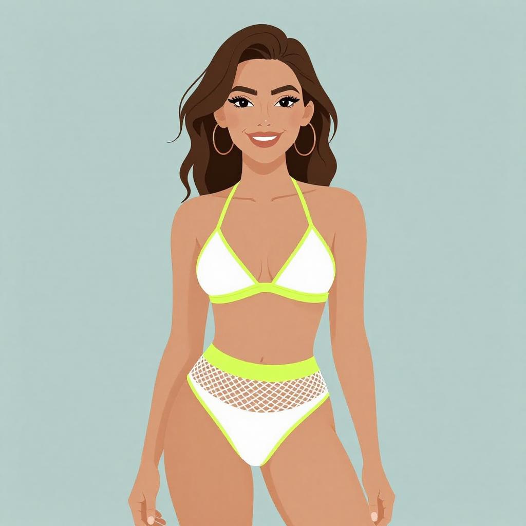 Woman with pretty face and pretty hair. smiling Woman, sporty beachwear, white mesh bikini top with triangle cups, neon green trim, adjustable spaghetti straps, matching high-waisted bikini bottoms with neon green waistband, cut-out mesh overlay, solid white underlay, simple studio background. --sref 1467