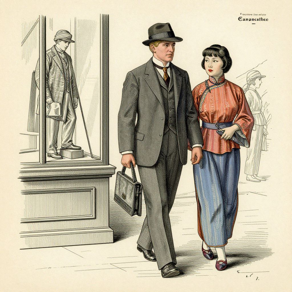 Patent Drawing 1920s San Francisco. Blonde man, classy, suit, fedora, walking next to a young chinese woman wearing traditional clothing. They are window shopping.,