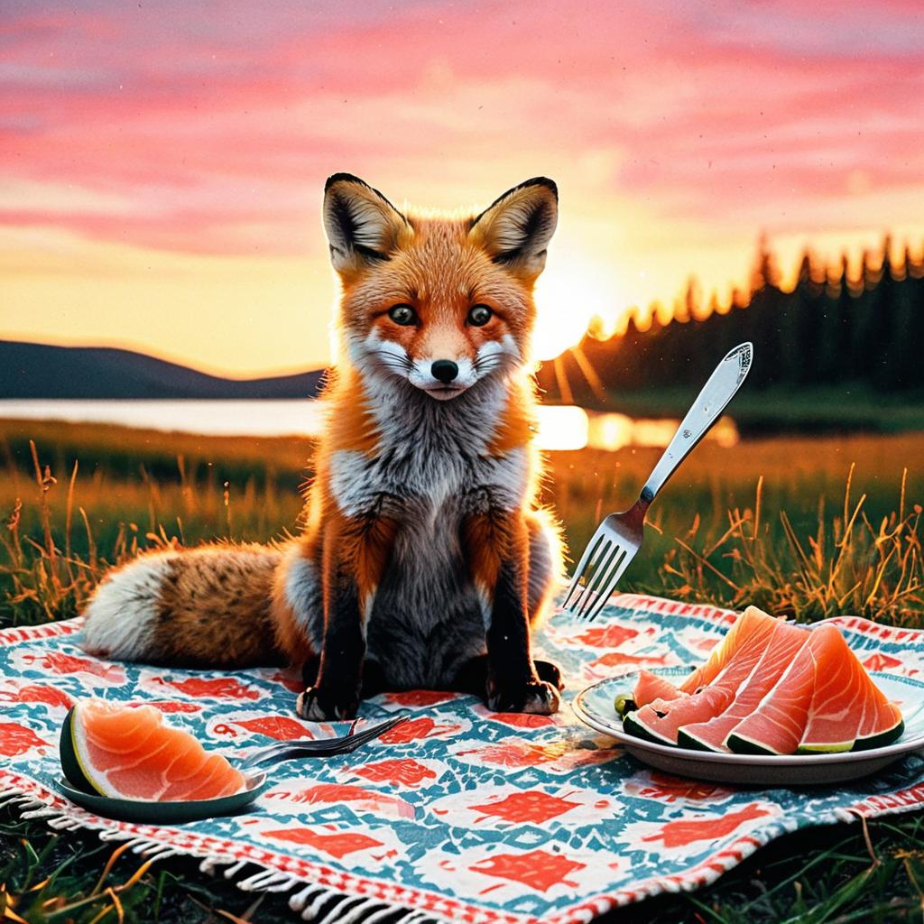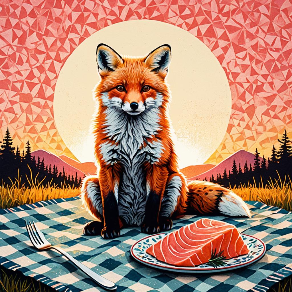 A colorful folk art illustration of a whimsical red fox cub sitting on a vintage patterned picnic blanket at sunset. The fox holds a tiny fork and knife, poised to eat a thick slice of pink salmon. The background features a glowing sun setting over a serene lake surrounded by pine trees and rolling hills, with textured brushstrokes and bold contrasting colors.