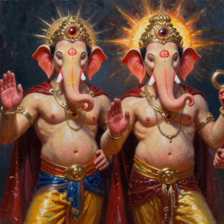 Superheroes Ganesha and Solar Eclipse, ultra realistic, unreal engine, cinematic lighting, oil painting, thick pallet knife strokes, Kael Ngu style,