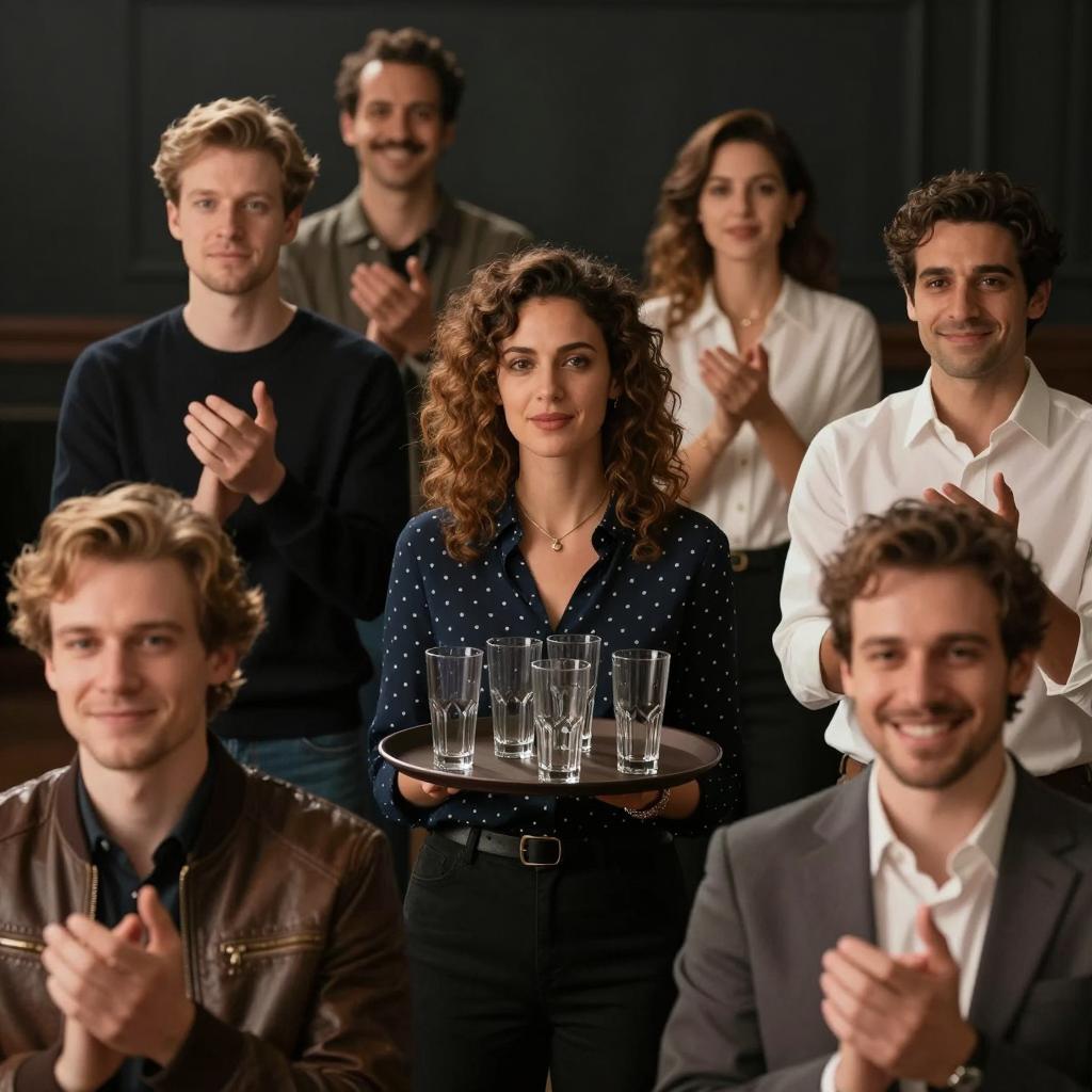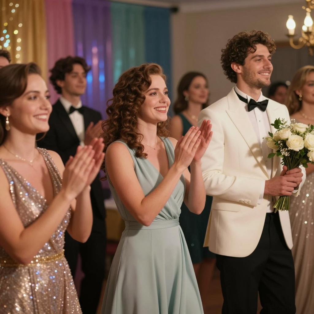 Group of people dancing in a dimly lit room. Central woman with curly brown hair, light green dress, clapping. Man beside her in white tuxedo, black bow tie, holding bouquet. Woman on left smiling, clapping. Background: colorful, sparkly decorations. Approximately 8 people. Warm, festive atmosphere.