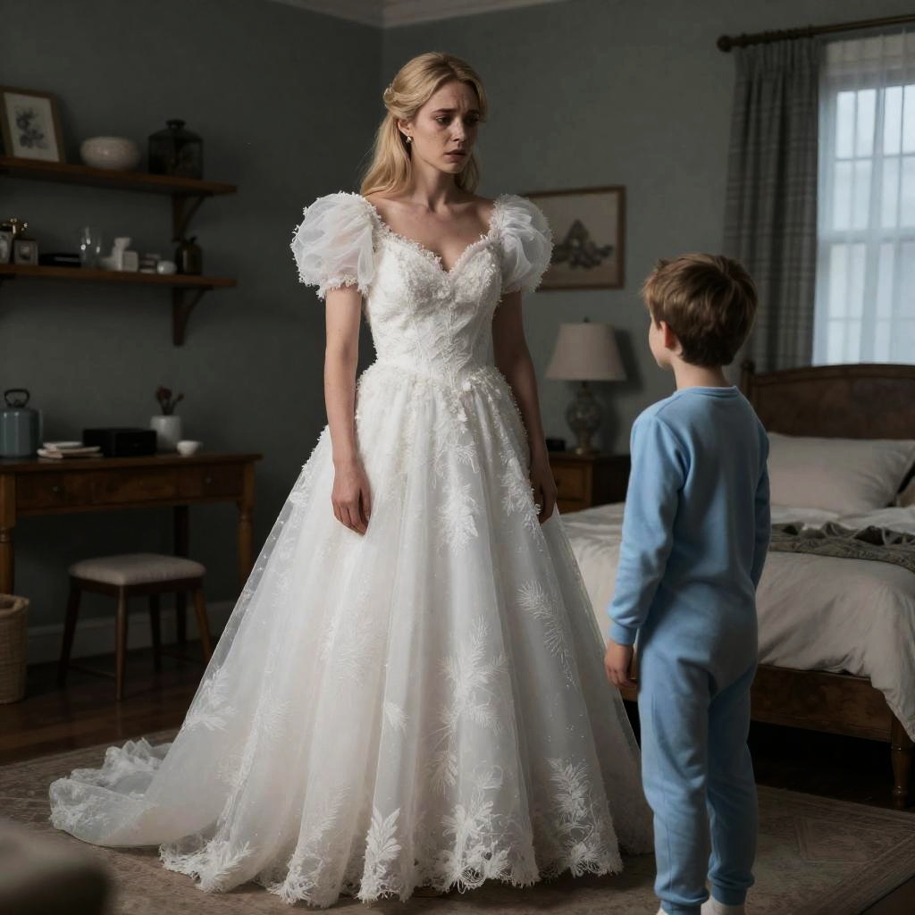 Middle-aged woman in white wedding dress, veil, and gloves, sitting alone on a black chair in a dimly lit room. She holds a small bouquet of white flowers, with a serious expression. Rows of empty black chairs fill the background.