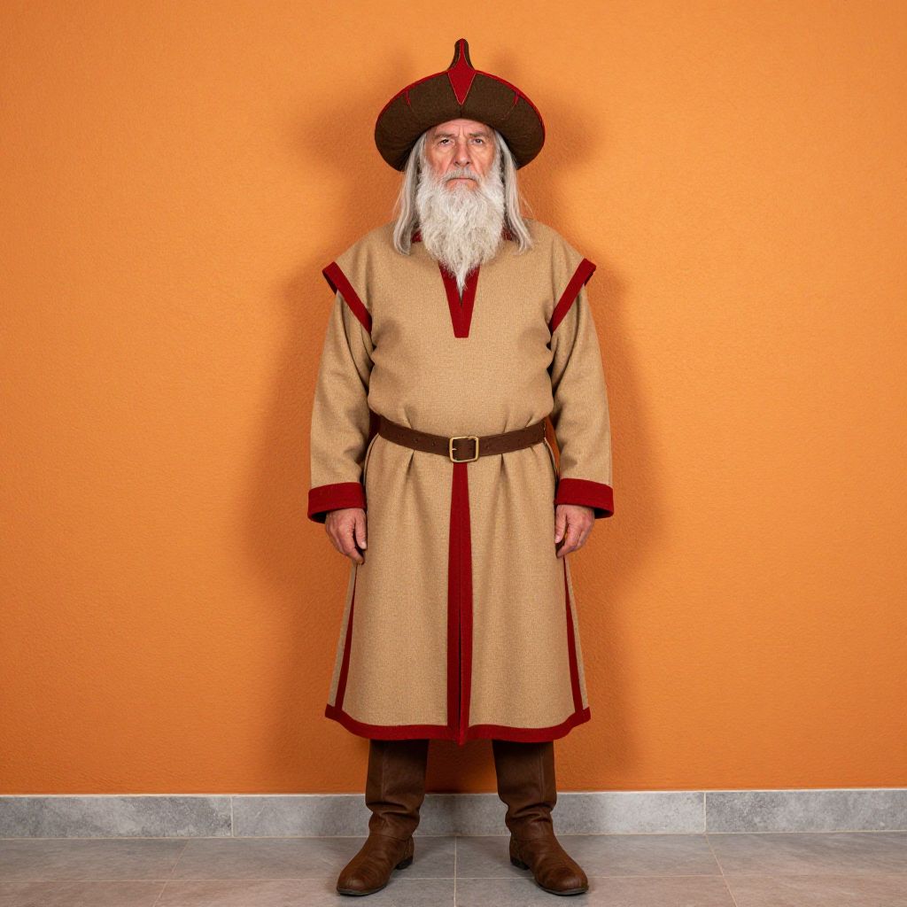 Photograph of an elderly white man with a long white beard, wearing a beige tunic with red trim, brown hat, and boots, standing against