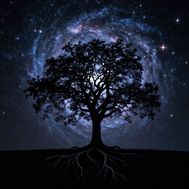 Silhouetted tree with sprawling roots against a glowing, spiral galaxy backdrop, filled with stars and cosmic light. Digital art.