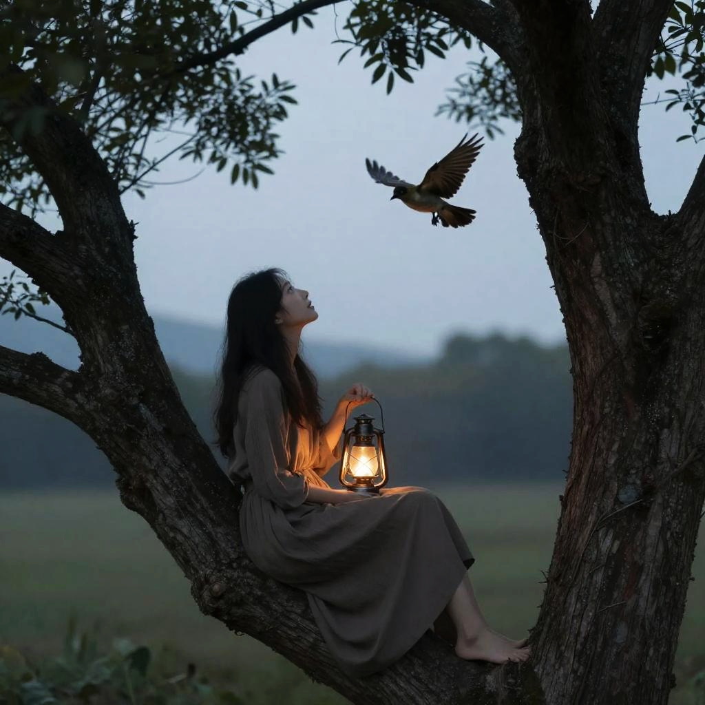 Realistic photo.A woman sitting on a tree with a lantern in her lap and a bird flying above her head, in the dawn. Inspired by Lisa Frank, fantasy art, serene atmosphere. realistic photo