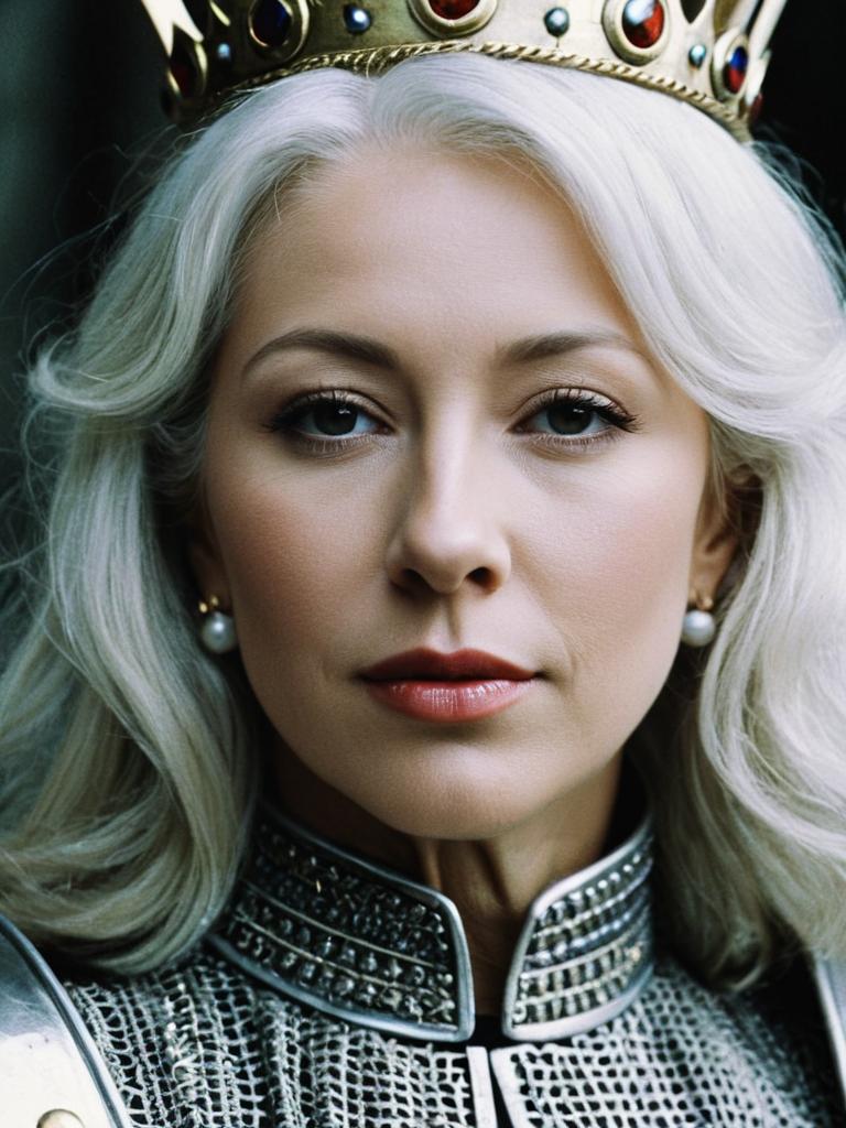 Woman in Helen Mirren Excalibur Costume, close-up detailed headshot with crown