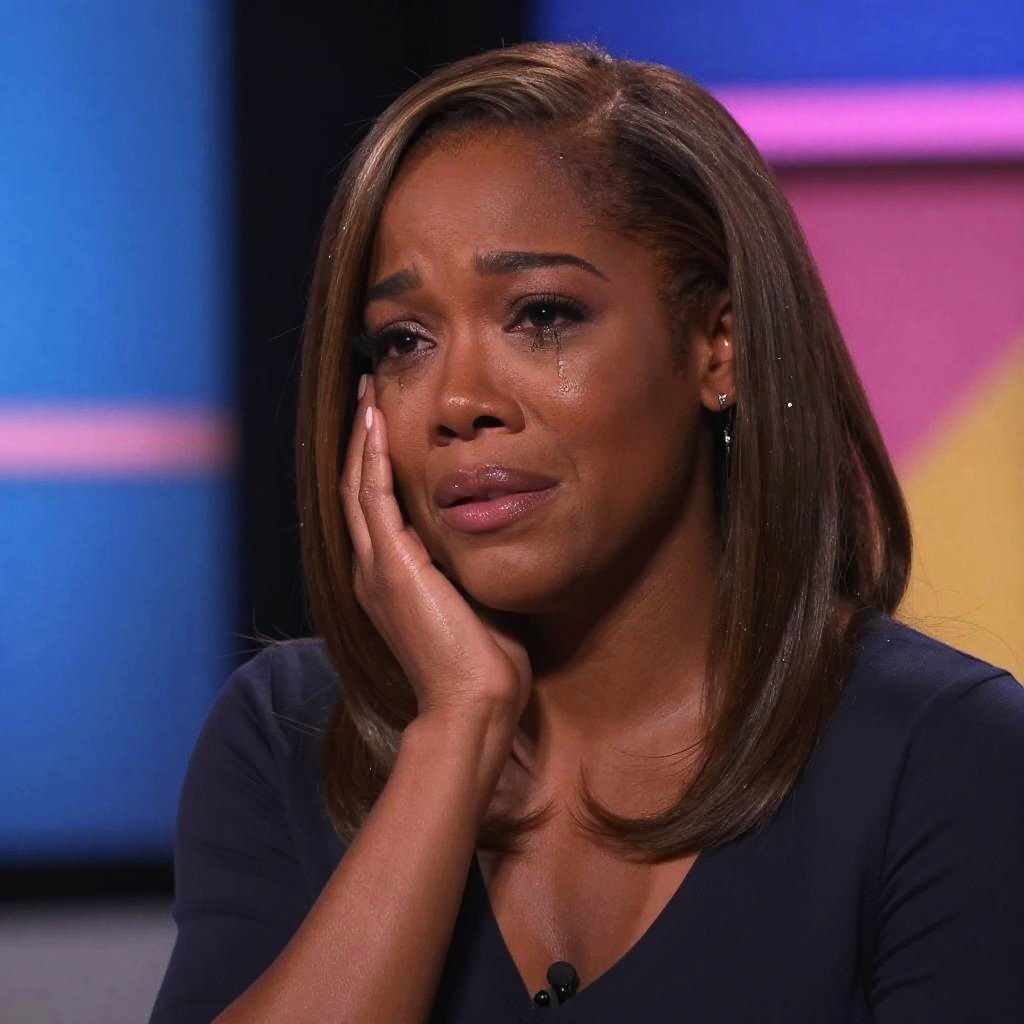 Crying Wendy Williams, emotional close-up, tears streaming down her face, studio background, dramatic lighting, vivid colors, expressive portrait, digital art style
