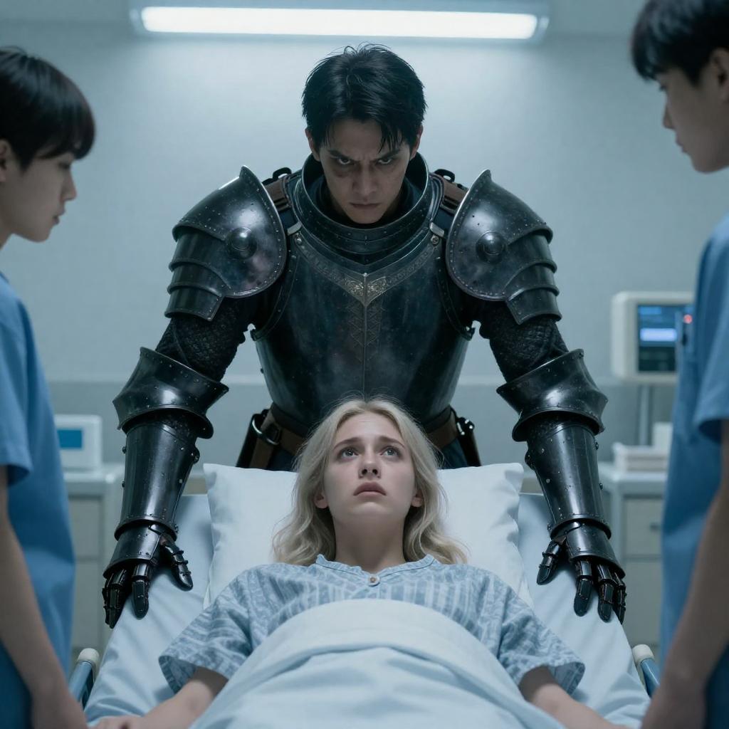 Photograph of a menacing figure in dark, ured armor leaning over a terrified person with light-colored hair on a hospital bed. Bright, bluish light fills the background. Figure's intense gaze and armored hands dominate the scene. Two people.