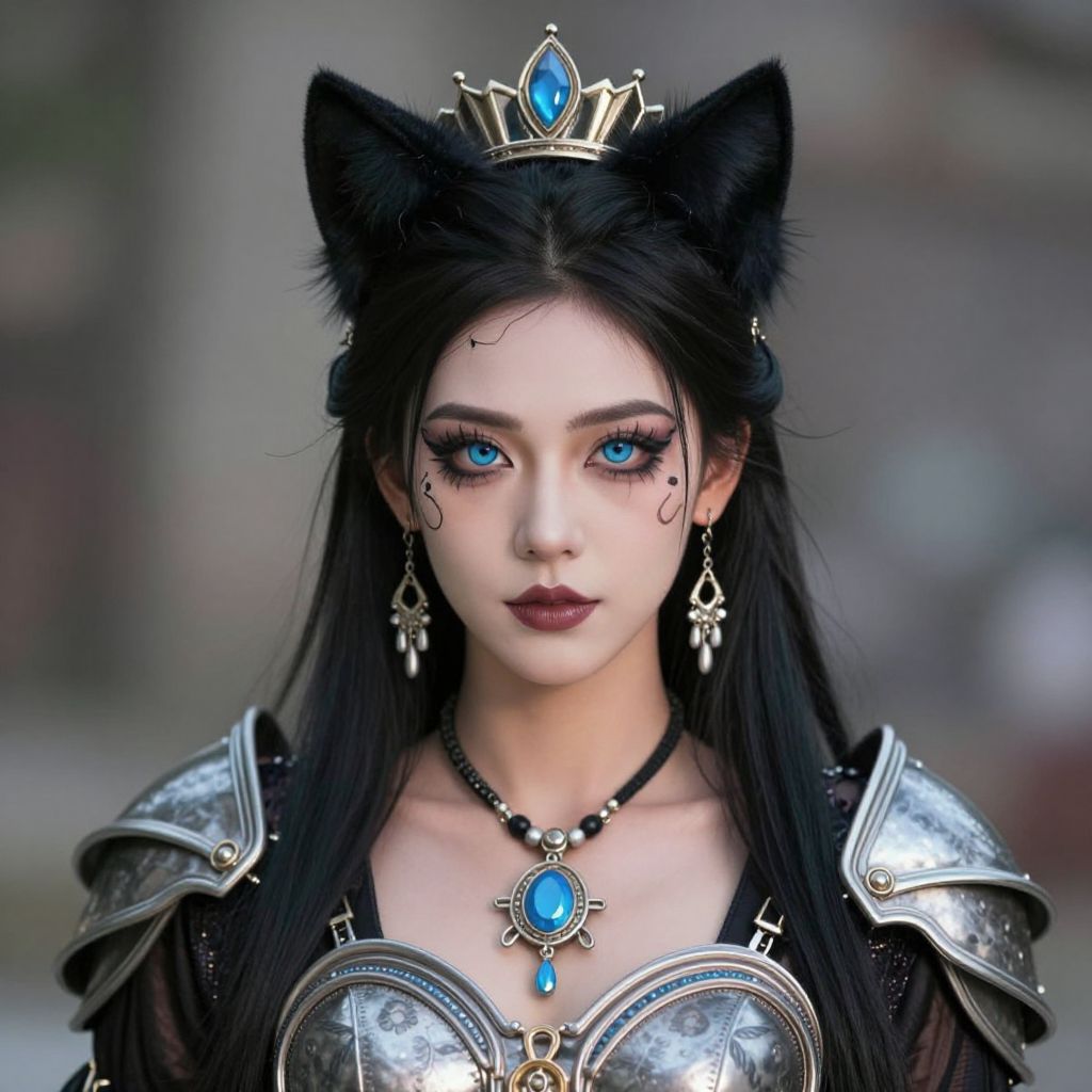 Catrina man costume, solo, 1girl, armor, jewelry, black hair, earrings, long hair, realistic, looking at viewer, crown, animal ears, blurry, upper body, blue eyes, cat ears, lips