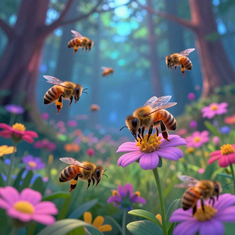 Photograph of vibrant forest meadow with colorful flowers, six bees hovering and landing on pink and purple blossoms, soft blue and green background.