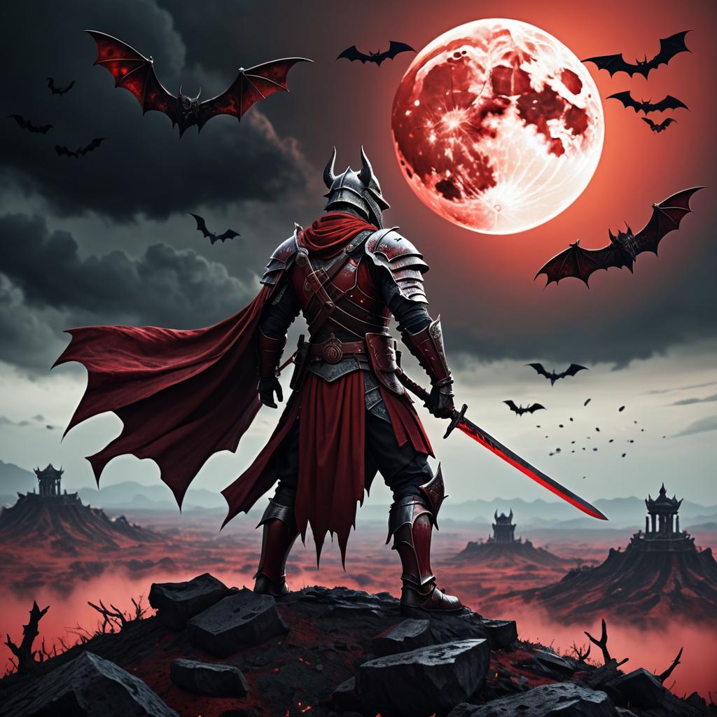 A fantasy warrior standing on a hill overlooking a battlefield filled with fallen soldiers and shadowy figures, a gigantic blood-red full moon dominating the sky, eerie silhouettes of bats flying, dark cloudy sky with ominous red-orange hues, the warrior in detailed armor holding a long sword, cinematic and epic scene full of tension and mysticism, hyper detailed, dramatic lighting, atmospheric depth, rendering style suitable for high resolution digital fantasy art