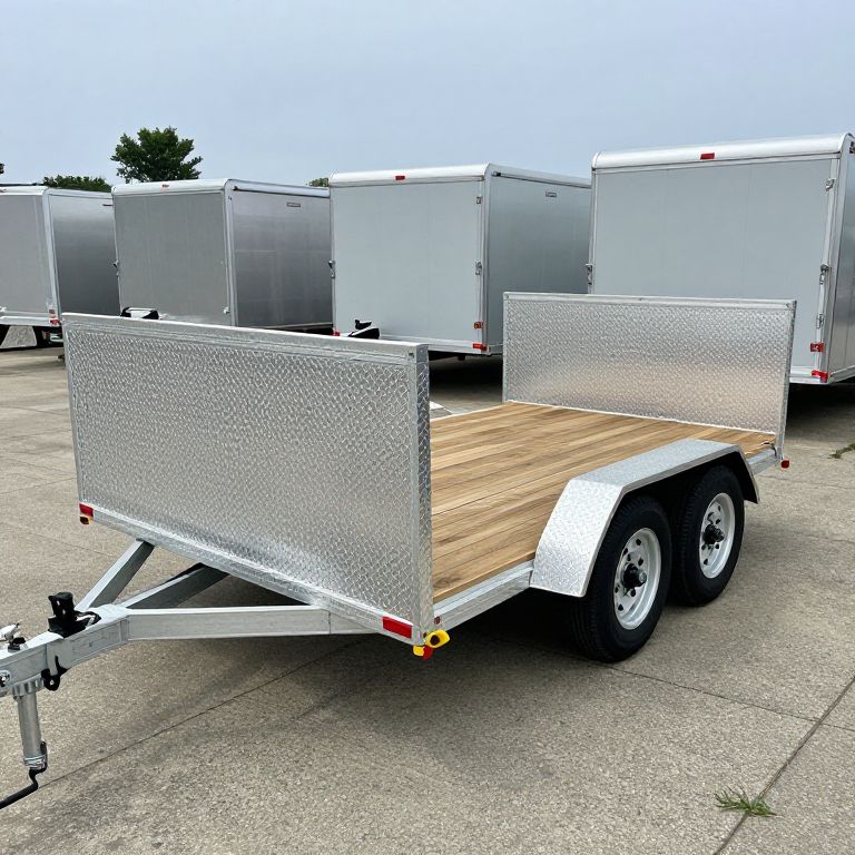Quality Trophy 5x8 aluminum utility trailer featuring diamond plate sides, stacked ramps, and a wooden deck bed, parked outdoors with multiple similar trailers visible in the background.