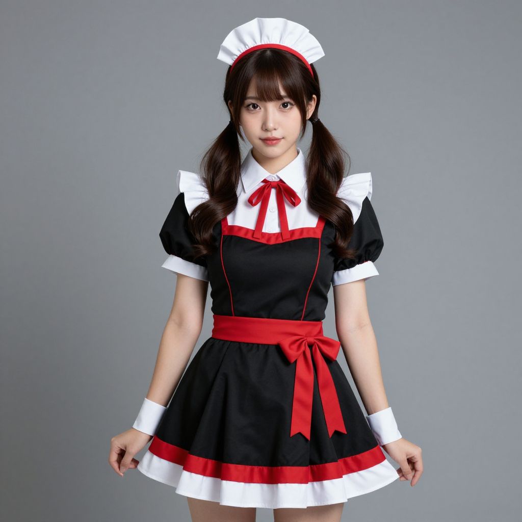 Asian woman in black and white French maid outfit with red ribbon, pigtails, white apron, and red bow, standing against gray background.