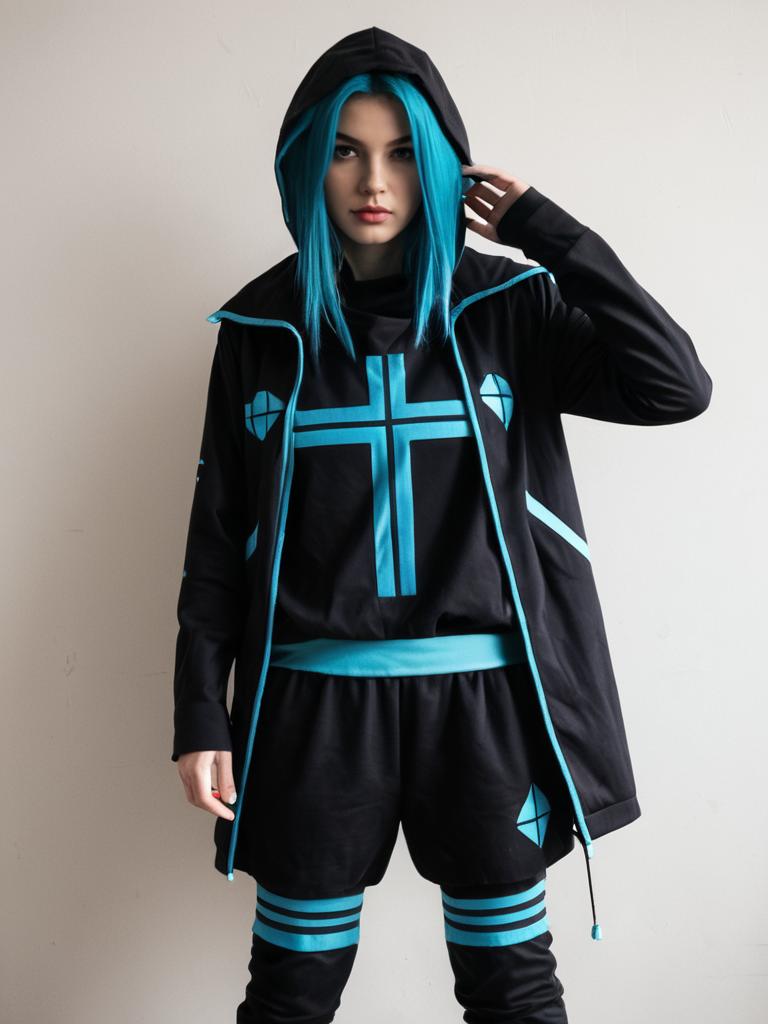 Young woman wearing a detailed Soma Cruz cosplay costume featuring a black hooded jacket, black shorts, and black top with bright blue cross and geometric patterns. The outfit includes matching black leggings with blue stripes. The cosplayer has striking blue hair and is posing against a plain white background.
