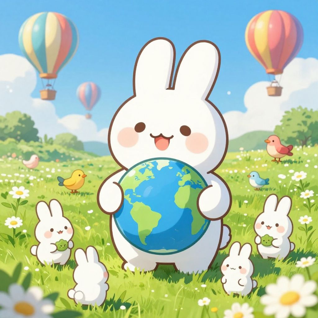 Cute digital illustration of a white bunny holding a blue Earth, surrounded by smaller bunnies and colorful birds in a sunny, floral meadow with