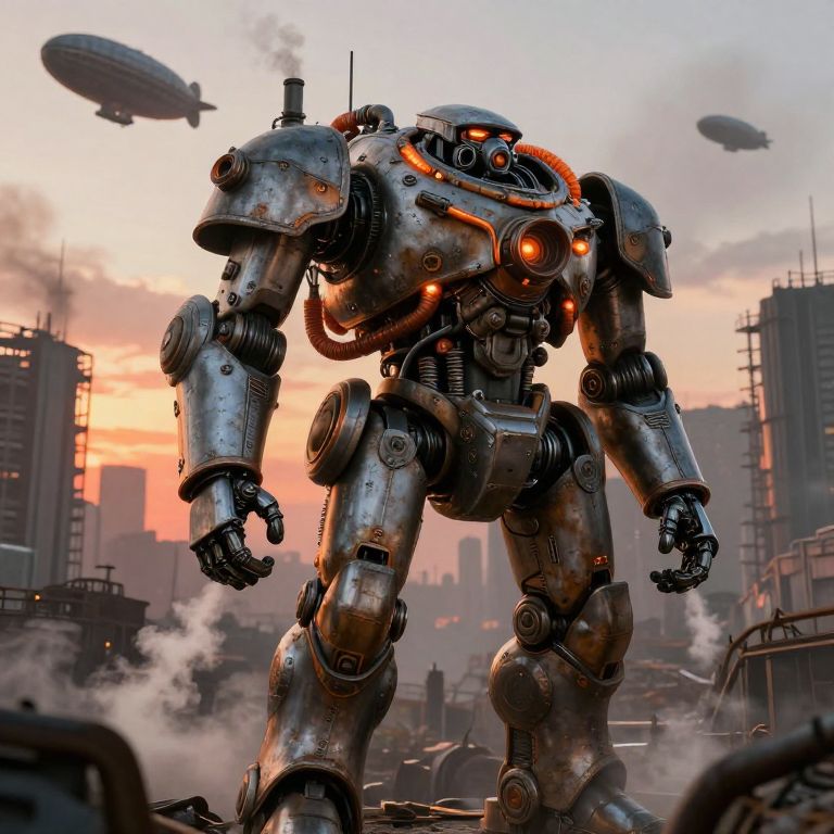 Dieselpunk mech suit standing tall in a gritty industrial cityscape, weathered metal plates with glowing orange tubes, steam vents releasing vapor, intricate mechanical joints, set against a smoky sunset sky with vintage airships flying overhead, detailed and atmospheric.