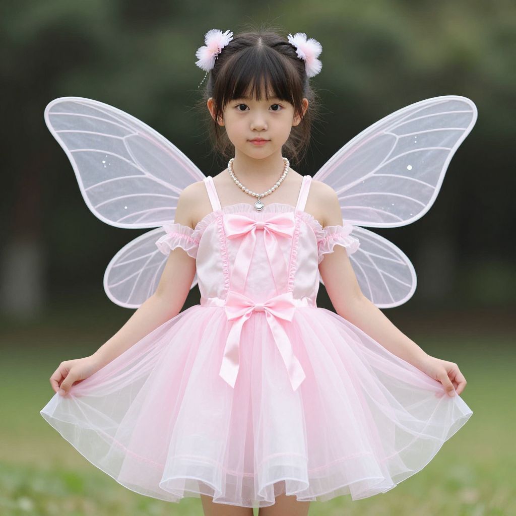 Photograph of an Asian girl with fair skin, black hair in pigtails adorned with white floral hair clips, wearing a pink off-shoulder, tulle dress with a bow at the chest. She has translucent, fairy-like wings attached to her back and a pearl necklace. She stands in a green, blurred outdoor setting, holding the skirt of her dress outwards. Her expression is neutral, and the overall style is whimsical and childlike. The image has a soft, dreamy quality with gentle lighting.