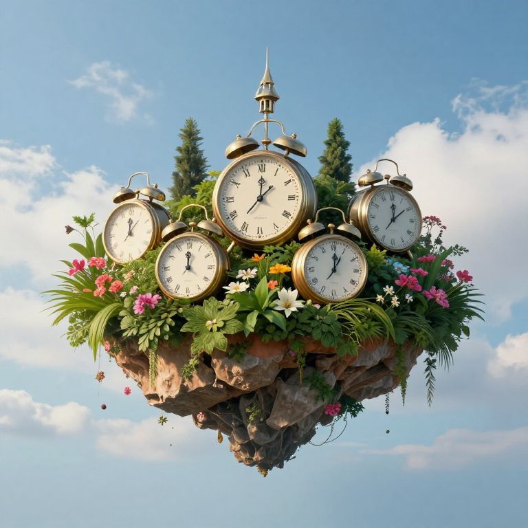 Photograph of a floating, rock-like arrangement against a bright blue sky with white clouds. The base is a rough, gray rock adorned with green foliage, pink flowers, and white blossoms. Atop the rock are six vintage-style, round clocks with black Roman numerals, gold frames, and black hands, each displaying a different time. Two tall, dark green conifer trees flank the clocks. The clocks and plants are arranged symmetrically, creating a whimsical, garden-like floating island. The sunlight highlights the vibrant colors and textures, enhancing the surreal, magical atmosphere of the image.