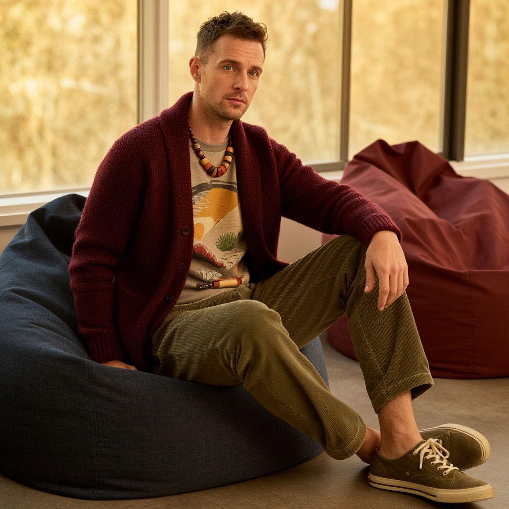A man, textured knit cardigan in deep burgundy, graphic tee with retro print, corduroy trousers in olive green, lace-up canvas shoes, chunky wooden necklace, cozy lounge area with bean bags, soft golden light filtering through large windows, relaxed expression, warm and inviting atmosphere. Man has masculine face and piercing eyes